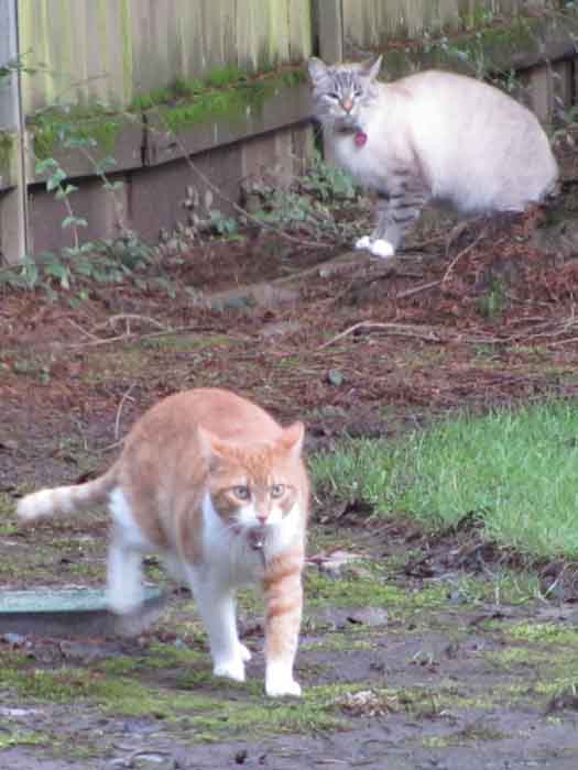 But I’m no dummy.  Over time, I dug a little passageway under the fence, so now it’s no problem commiserating with her.  Plus every morning, I pester Mason and Alice with some obnoxious meowing at 4 am.  They relent –almost sleepwalking – and let me out.  I really enjoy manipulating those two humans.